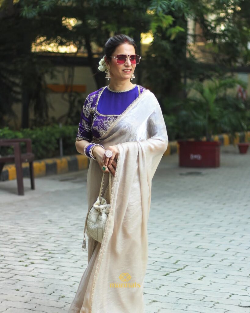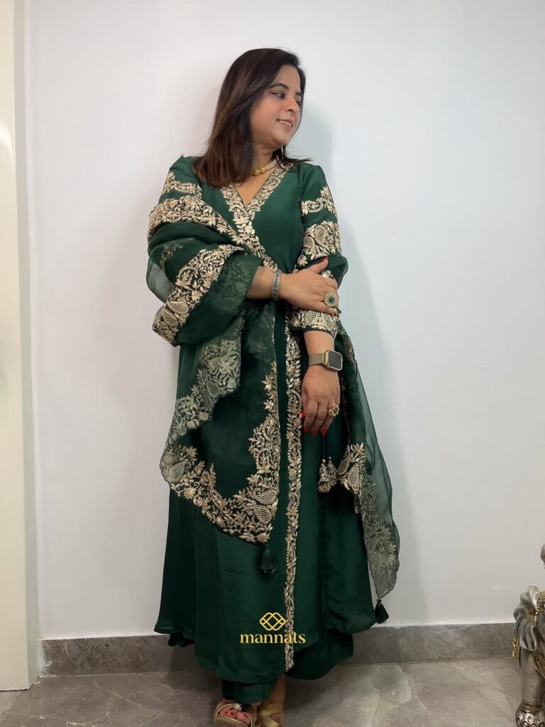 This elegant ensemble is crafted in Banarasi Chanderi Georgette, known for its rich texture and graceful fall. It is paired with a contrast red Mukaish dupatta, adding a festive sparkle and timeless charm—perfect for weddings, festivities, and special occasions. 🕊️💜