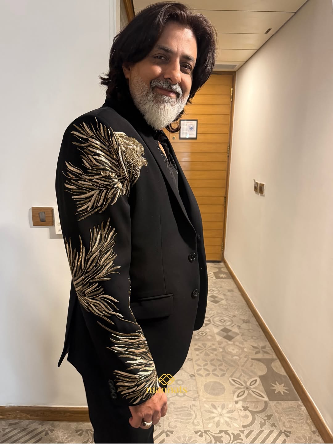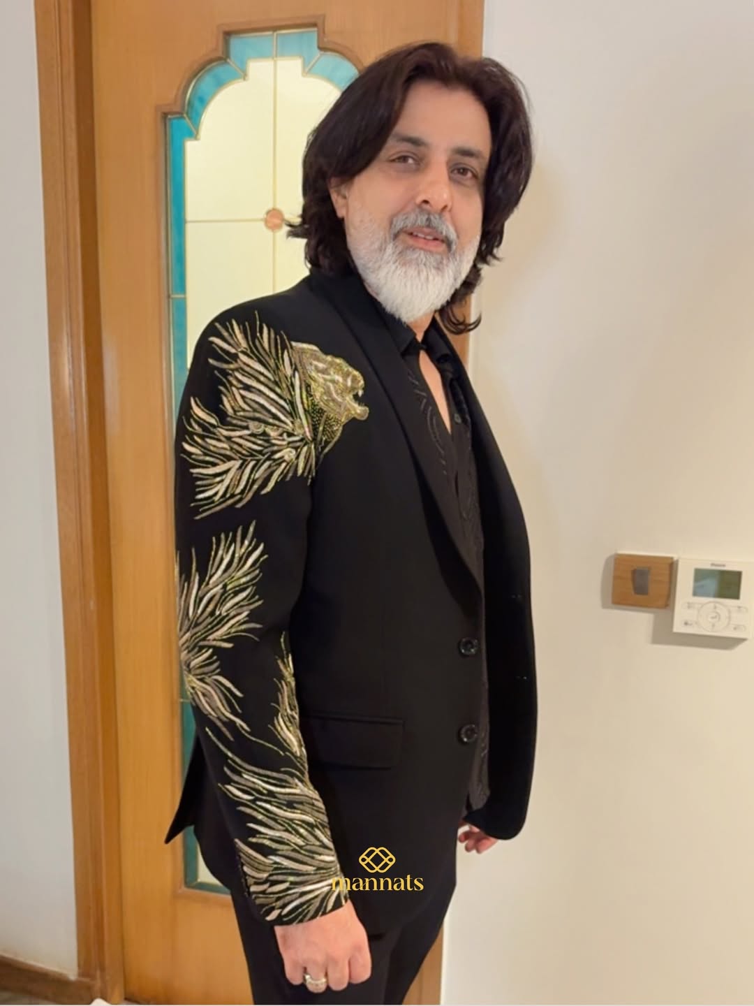 Exclusively available on customization only. Presenting elegance redefined — Black coat with hand-embroidered sleeves.🖤🧵